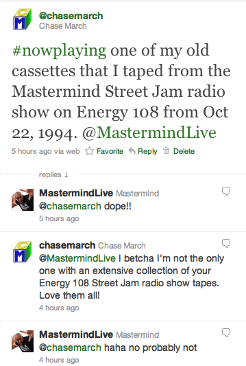 The Mastermind Street Jam was required listening in the 1990’s. If I couldn’t listen to the show on Saturdays, then I would just put in a tape and let it roll so I could listen to the show later.