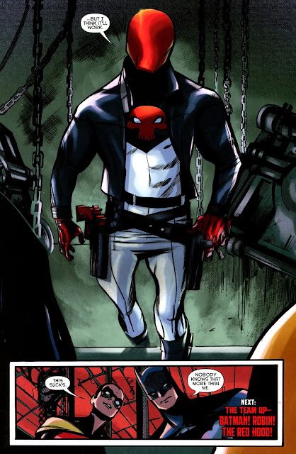 He escapes the prison and once again dons the mantel of The Red Hood. In the panel before this final page teaser to set up the next issue, he mentions how he had to improvise with his costume . . .
