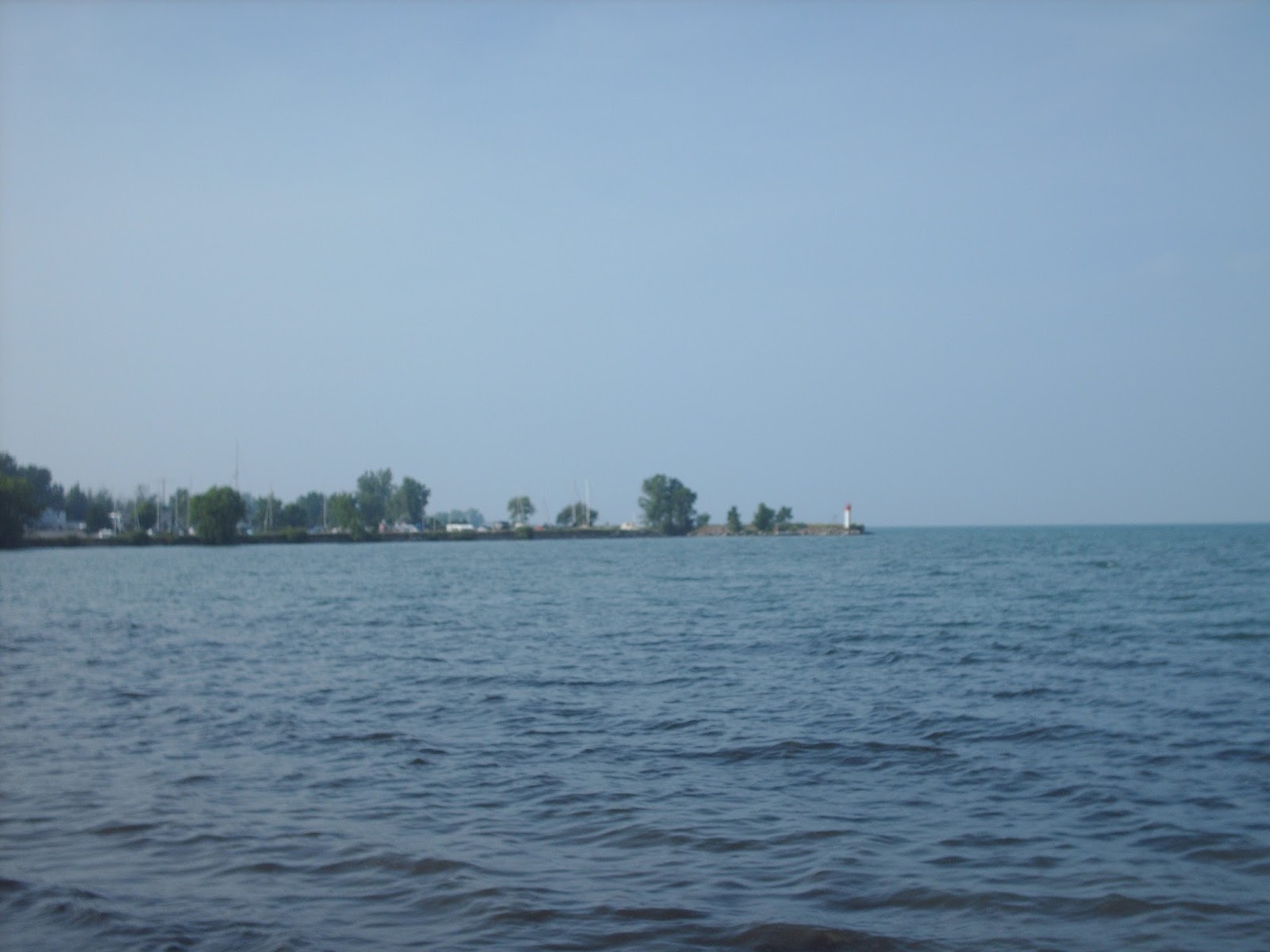 You can see the red and white lighthouse at the edge of the water in the distance.