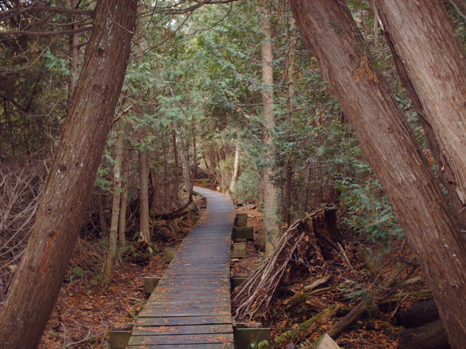 This trail meanders through a cedar swamp, a very rare type of wetland for southern Ontario. A boardwalk takes you through the oldest, most mature part of the cedar swamp.*