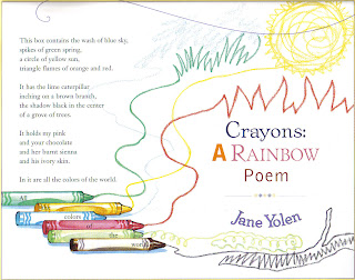 I presented “Crayons: A Rainbow poem” by Jane Yolen to my class. I pointed out how each line of the poem contains a colour word. We looked at how each line also contains details such as shapes (circles, triangles, spikes)