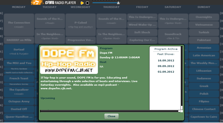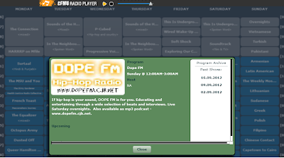 First click on “programming” at the top of the page, find “Dope FM” in the grey area on Saturday, and click on it.