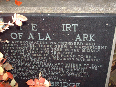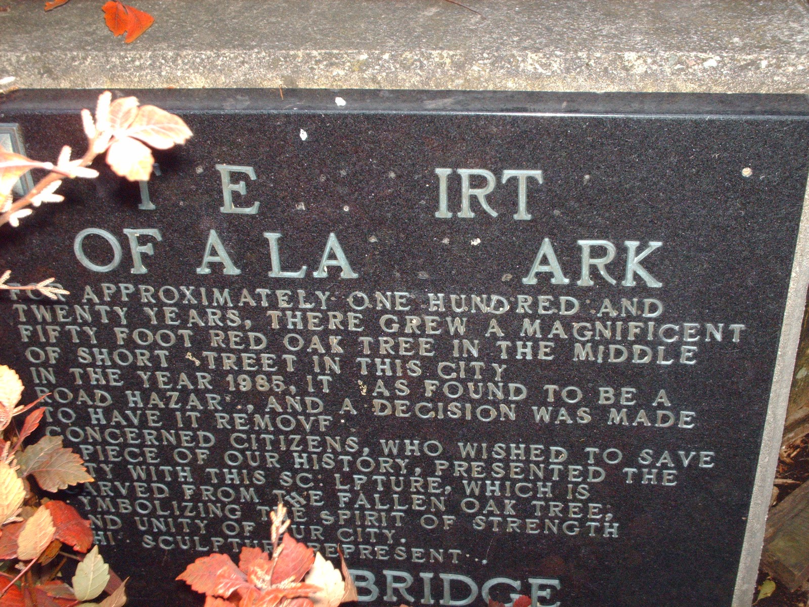 Concerned citizens who wished to save a piece of our history, presented the city with this sculpture, which is carved from the fallen oak tree, symbolizing the spirit of strength and unity of our city.”