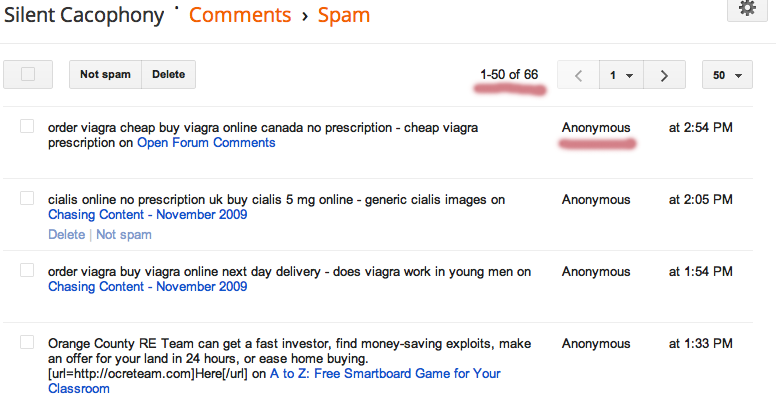 With the screen capture above, you can see that there were 66 spam comments posted just today. And this has been happening daily for over a month now. It’s starting to get really frustrating.