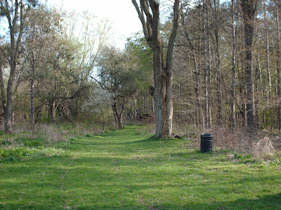 It starts out with a grass trail beside the pond and then leads back towards the woods.