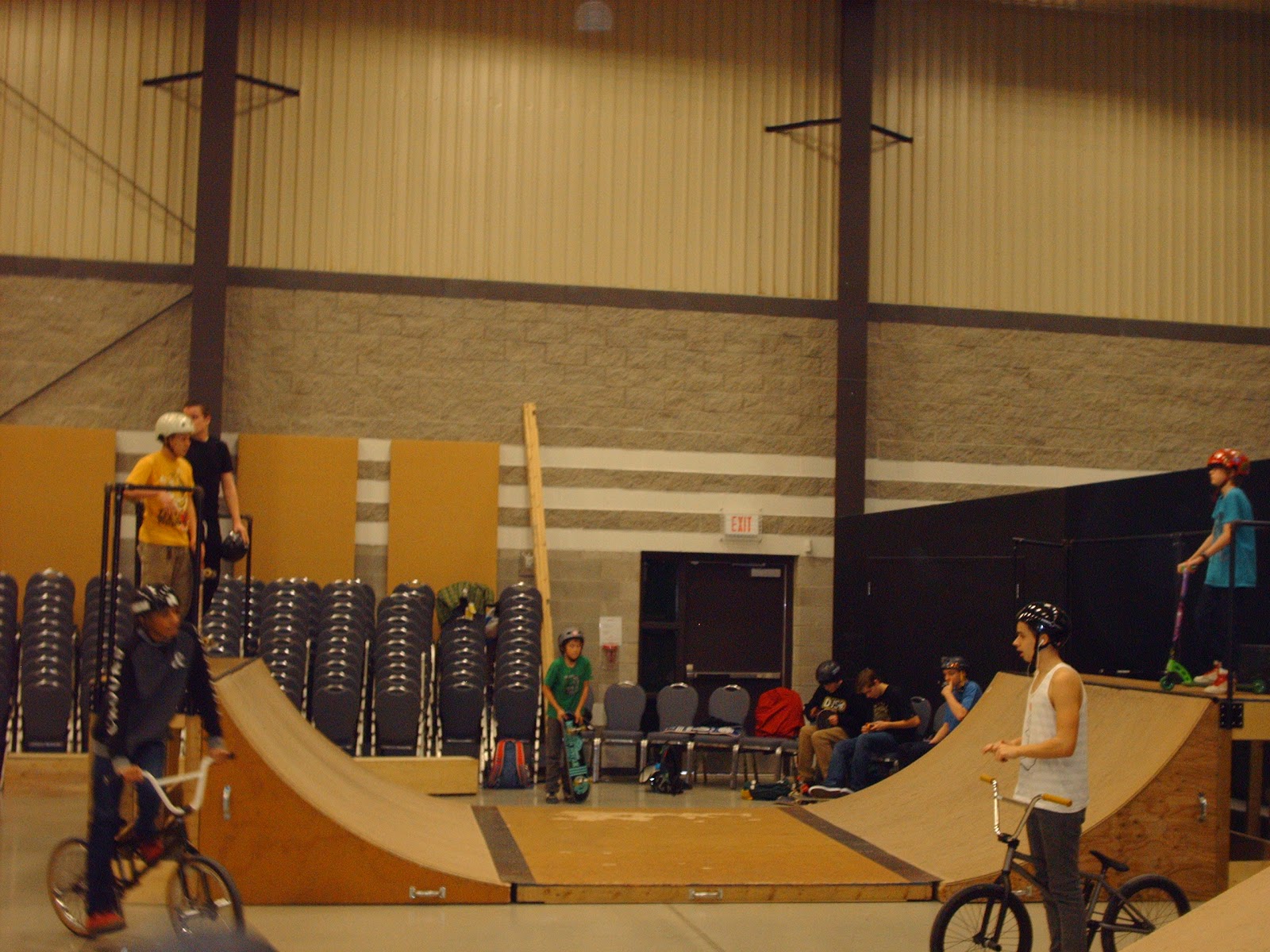 The floor we are skating on is where the congregation sits. You can see all of the chairs stacked up along the wall.