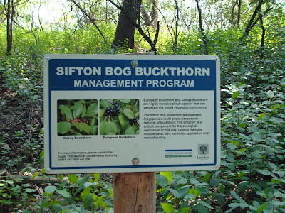 The Sifton Bog is one of the most southerly acidic bogs in Canada. It contains a number of rare species including four types of carnivorous plants. Among the latter are the sundews, Drosera intermedia, Drosera rotundifolia, and the purple pitcher plant. The central bog vegetation is dominated by Sphagnum and Chamaedaphne calyculata (leatherleaf), with a few short larches (Larix laricina) and black spruce (Picea mariana)