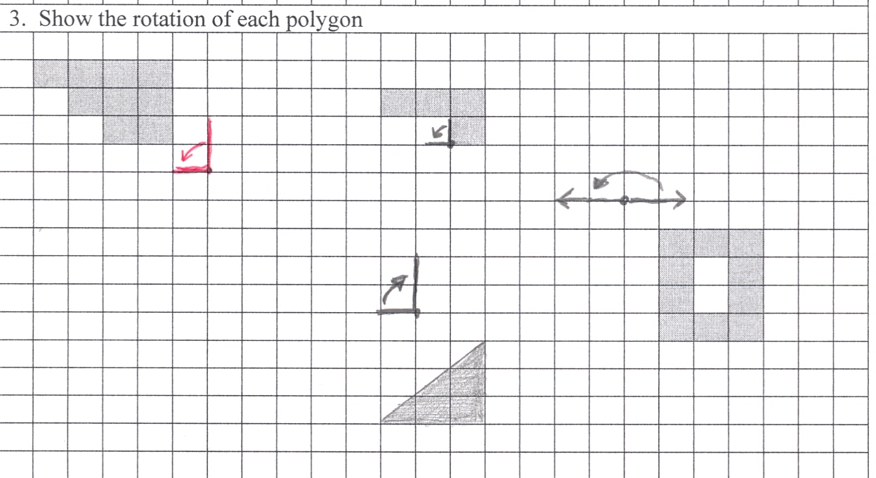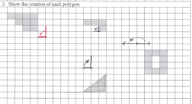 This worksheet deals with Transformational Geometry. The symbols above show that the object needs to be rotated on a grid. The first shape should be rotated 1/4 turn in a clockwise direction. The second figure needs to be redrawn after a 1/4 turn in a counterclockwise direction. The last two red direction symbols indicate that a half turn is needed.