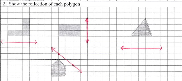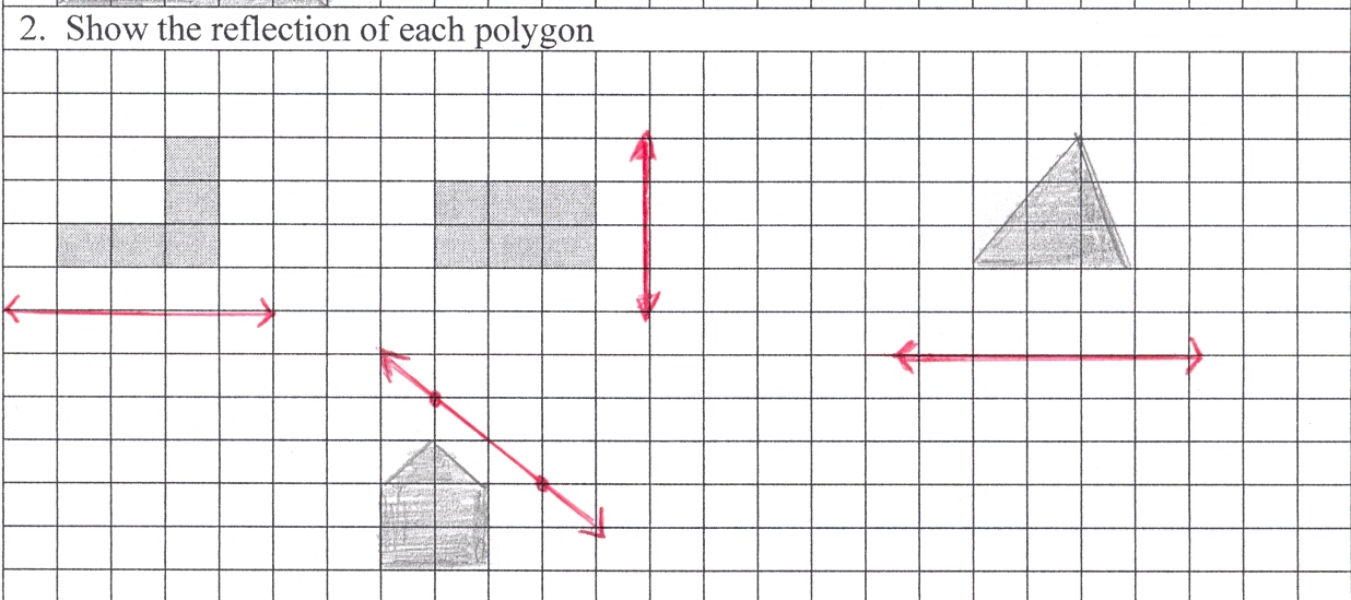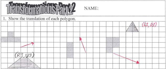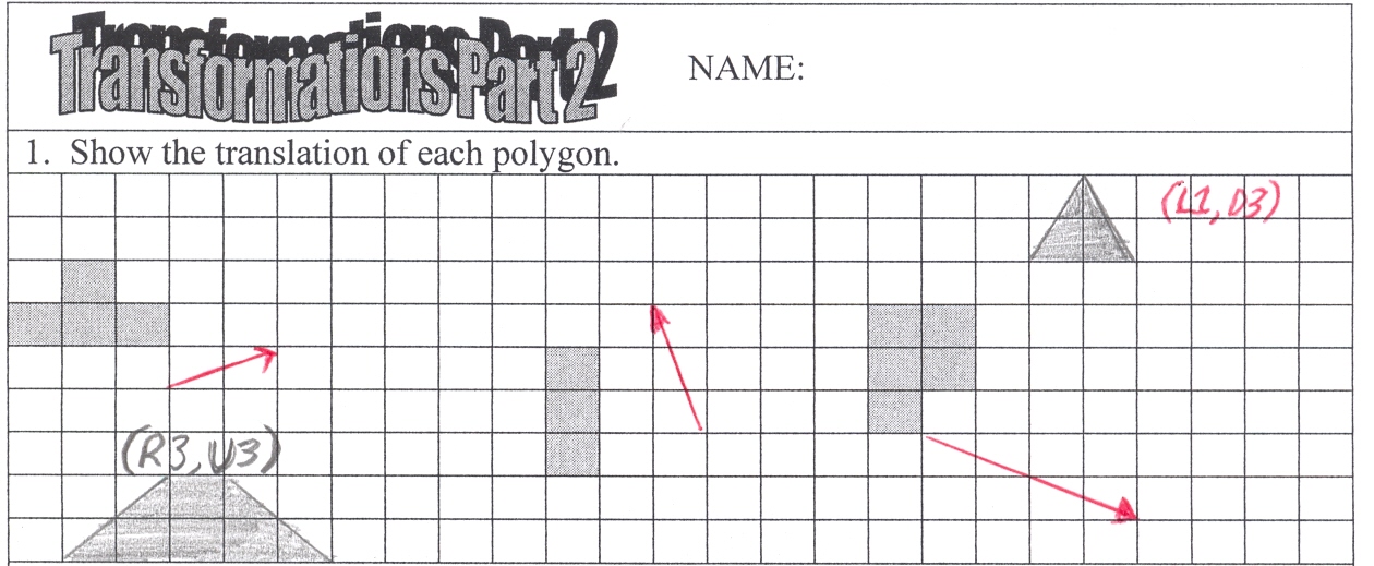 The second page of the worksheet allows the students to get extra practice using the three transformations of geometry. Number 1, translation (meaning that the shape is slid) Students will sometimes refer to this action as a slide.