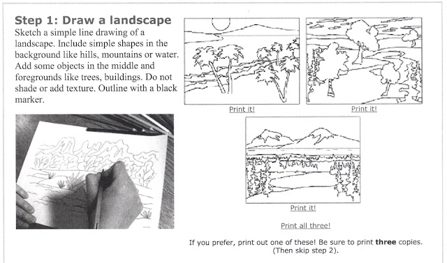 Step 1 – Have the students draw a landscape. For younger students, you can provide them with 3 coloring pages of the same scene.