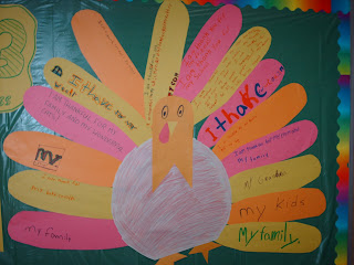 The picture on this post is the “We are Thankful” turkey we made together in class this week. Each tail feather was made by a different person and gives the reasons why we are thankful.